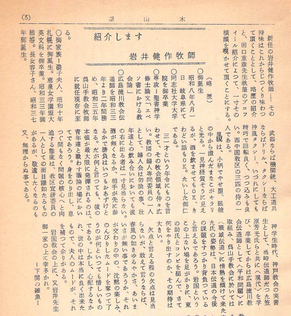 神学生時代、神戸教会の実習生として、当時伝道師だった笠原芳光氏らと共に<現代>を学び、卒業してからは広島流川教会伝道師として<平和問題>に取り組み、呉山手教会に於いては<職域伝道>に情熱を傾けて来た氏の姿勢は、日本伝道の今後の課題をすっかり背負っていると言えるであろう。岩国というこの上ない場を足がかりに、東の助氏(岩国東教会牧師 杉原助)とコンビを組んで、さて何をやり出すのか、その期待は大きい。