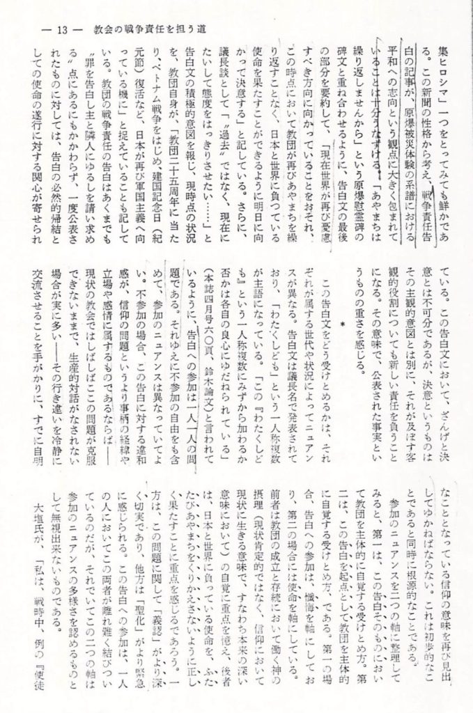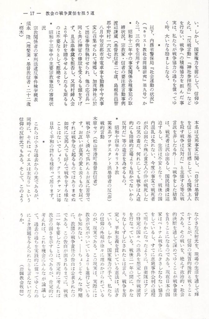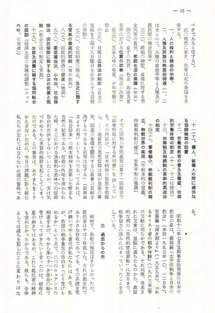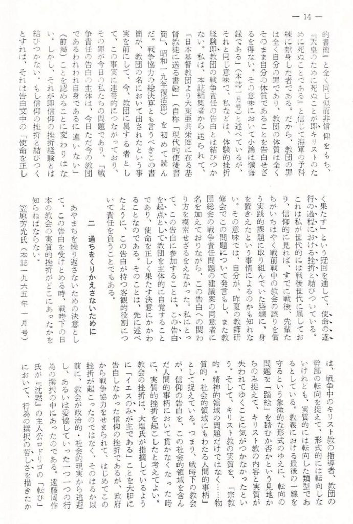 これらは小さな過去からの光であるが、同時に、それは「イエスは主なり」という信仰の反射光でもある。そして、このような小さな反射光を、現場の生活を通して輝かすことが、信仰の実質的挫折と戦うことである。その戦いを、絶えず政治的・社会的決断を通して深めてゆくことが戦争責任を負うことになるのである。現在日本の国家はベトナム戦争にぬきさしならない協力をしているし、すでに恵庭(えにわ)事件公判の過程で明らかになったように、自衛隊はアジアの特定の国々への派兵を想定して作戦演習を行なっている。戦後21年の間に、かなりなし崩しにされたとは言え、戦争を否定し、平和主義を貫いている憲法は、活きている。しかし、国家権力の手で、私たちの信仰の外堀が徐々に埋めかけられているのが、現実である。この現実は、実際には教会が気がついているよりも進行しているかも知れない。―ちょうどそんな時期に、教団の戦争責任の告白は公表されたのである。この告白が出されるまでに、戦後21年を要したことは、否定的に考えれば教会の弱さを示すものであるが、肯定的に考えれば、これを機会にみんなが論議して、過去の過ちを実践的に償ってゆくためによき課題を与えられたとも言えないだろうか。