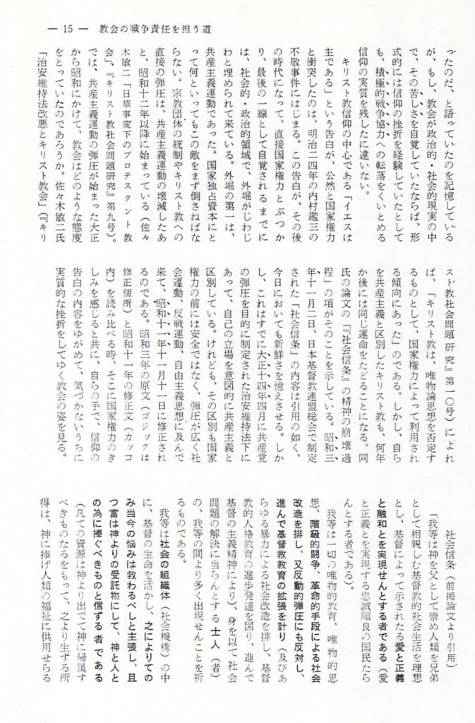 キリスト教信仰の中心である「イエスは主である」という告白が、公然と国家権力と衝突したのは、明治24年の内村鑑三の不敬事件にはじまる。この告白が、その後の時代になって、直接国家権力とぶつかり、最後の一線として自覚されるまでには、社会的・政治的領域で、外堀がじわじわと埋められて来ている。外堀の第一は、共産主義運動であった。国家独占資本にとって何といってもこの敵をまず倒さねばならない。宗教団体の統制やキリスト教への直接の弾圧は、共産主義運動の壊滅した後、昭和12年以降に始まっている(佐々木敏二「日華事変下のプロテスタント教会」、『キリスト教社会問題研究』第9号)。では、共産主義運動の弾圧が始まった大正から昭和にかけて、教会はどのような態度をとっていたのであろうか。佐々木敏二氏は「治安維持法改悪とキリスト教会(『キリスト教社会問題研究』第10号)によれば、「キリスト教は、唯物論思想を否定するものとして、国家権力によって利用される傾向にあった」のである。しかし、自らを共産主義と区別したキリスト教も、何年か後には同じ運命をたどることになる。同氏の論文の「『社会信条』の精神の崩壊過程」の項がそのことを示している。昭和3年11月2日、日本基督教連盟総会で制定された「社会信条」の内容は引用の如く、今日においても新鮮さを憶えさせる。しかし、これはすでに大正14年4月に共産党の弾圧を目的に制定された治安維持法下にあって、自己の立場を意図的に共産主義と区別している。けれども、その区別も国家権力の前には安全ではなく、弾圧が広く社会運動、反戦運動、自由主義思想に及んで来て、昭和11年11月11日に修正されるのである。昭和3年の原文(ゴシックは修正個所)と昭和11年の修正文(カッコ内)を読み比べる時、そこに国家権力のきしみを感じると共に、自らの手で、信仰の告白の内容をゆがめて、気づかないうちに実質的な挫折をしてゆく教会の姿を見る。