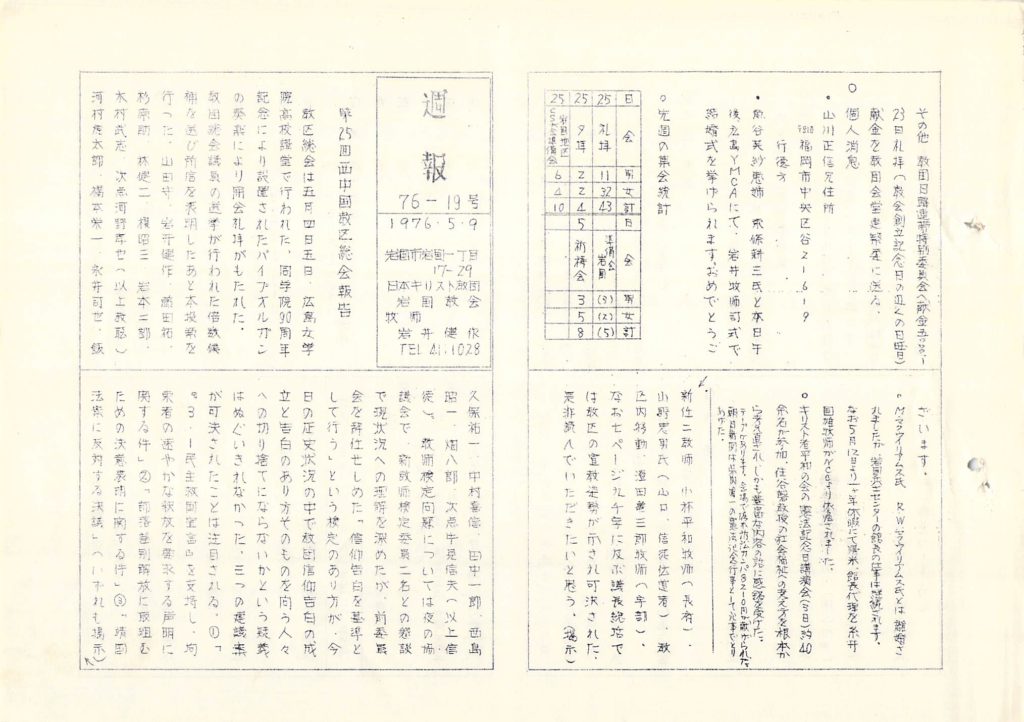 新任2教師、小林平和牧師(長府教会)、小野忠男氏(山口教会、信徒伝道者)。教区内移動教師、澄田亀三郎牧師(宇部教会)。