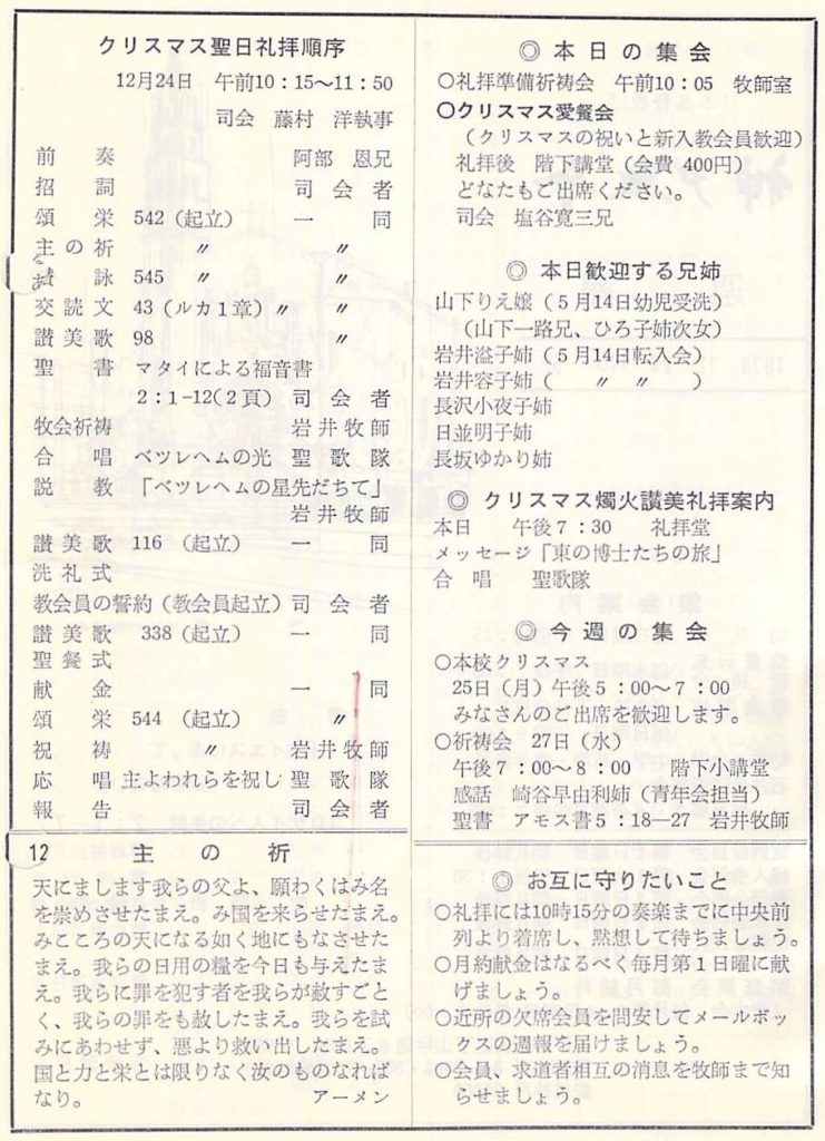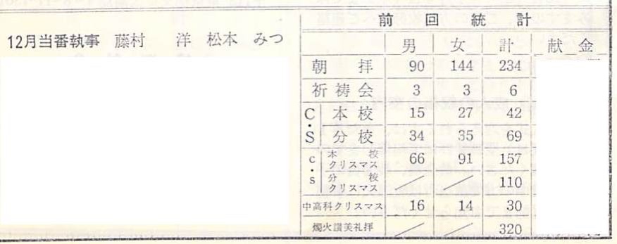 翌週の週報に、クリスマス礼拝234名、祈祷会6名、クリスマス燭火讃美礼拝320名、CS+CSクリスマス会408名と記録されている。