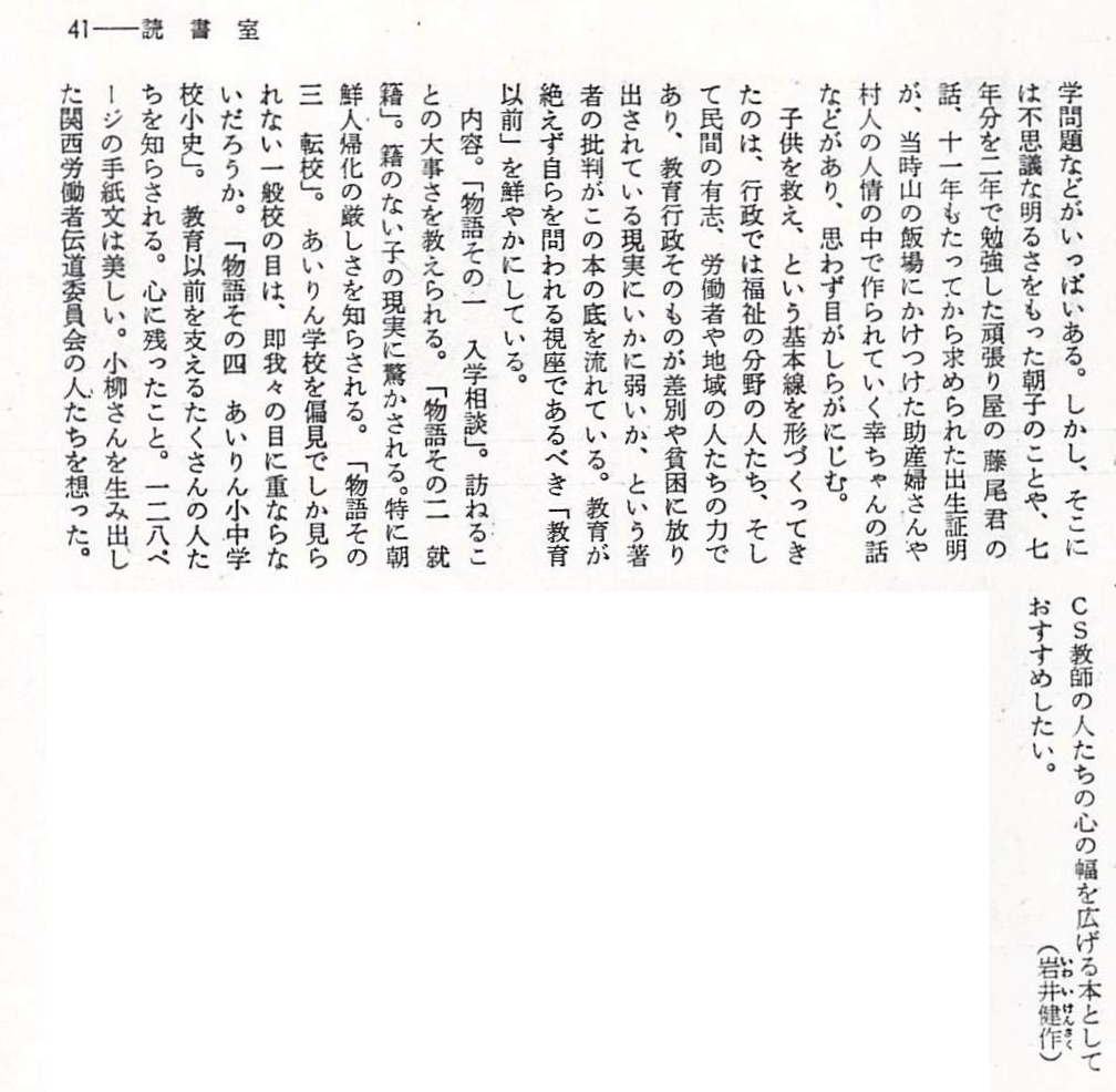 大阪は釜ヶ崎、市立あいりん小中学校というめずらしい学校の非常勤嘱託のカウンセラーを続ける小柳さんの話には、暗くて重い現実、例えば日雇い労働者の父子家庭の子の不就学問題などがいっぱいある。しかし、そこには不思議な明るさをもった朝子のことや、7年分を2年で勉強した頑張り屋の藤尾君の話、11年も経ってから求められた出生証明が、当時山の飯場に駆けつけた助産婦さんや村人の人情の中で育てられていく幸ちゃんの話などがあり、思わず目がしらがにじむ。