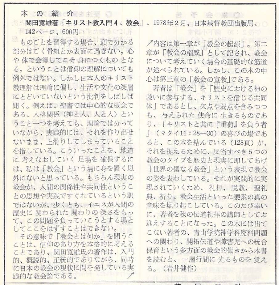 関田寛雄著『キリスト教入門4 教会』(日本基督教団出版局 1978年2月)