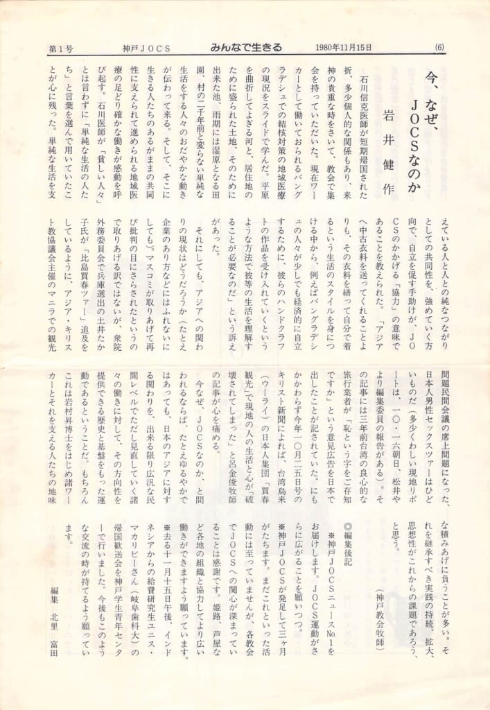 1980年11月15日発行「神戸JOCSニュース みんなで生きる」(第1号)掲載