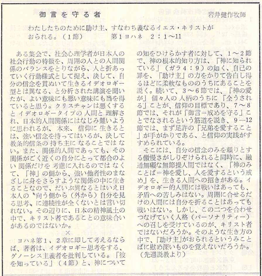 この日の説教、ヨハネ第一の手紙 2:1-11、「御言を守る者」岩井健作