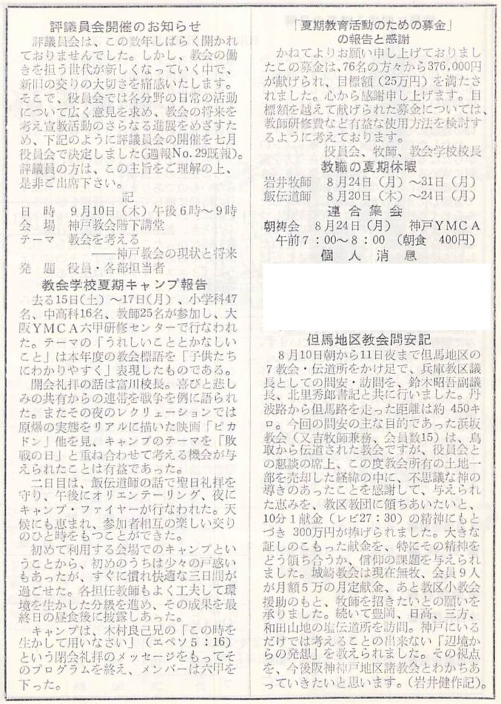 神戸教会週報、兵庫教区議長として問安