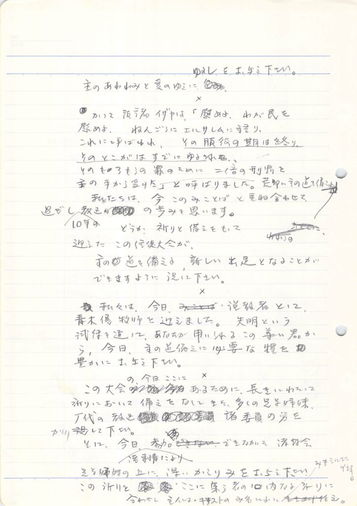 この大会の、今日ここにあるために、長きにわたって祈りにおいて備えをなしてきた、多くの兄弟姉妹、歴代の教区諸委員の労を省みて下さい。そして、今日、諸事情により参加できなかった諸教会兄弟姉妹の上に、深い省みをお与え下さい。この祈りを、ここに集う者の内なる祈りに合わせて、主イエス•キリストのみ名によりみ前に捧げます。