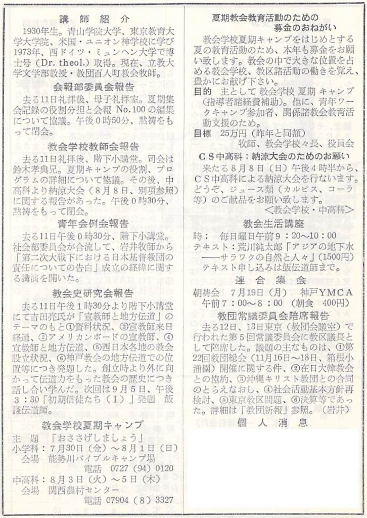 1982年7月18日(日)説教と講演:木田献一氏(立教大学教授、百人町教会牧師)