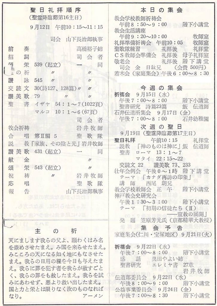 岩井牧師出張:翌週9月19日、神戸北教会講壇、担任教師就任式司式