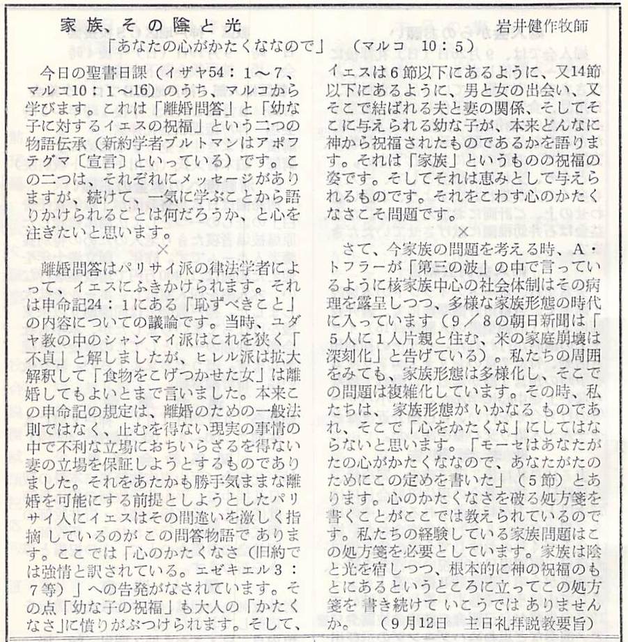 イザヤ 54:1-7、マルコ 10:1-16、説教題「家族、その陰と光」岩井健作