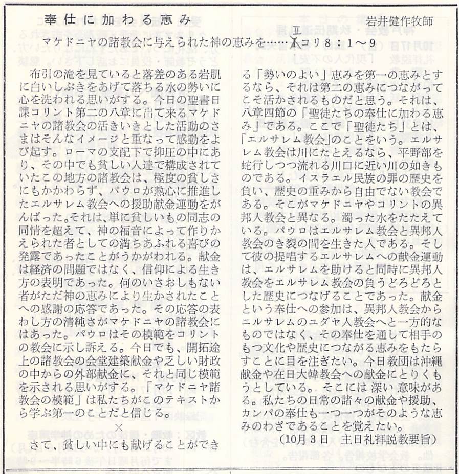 申命記 26:1-11、Ⅱコリント 8:1-9、説教題「奉仕に加わる恵み」岩井健作