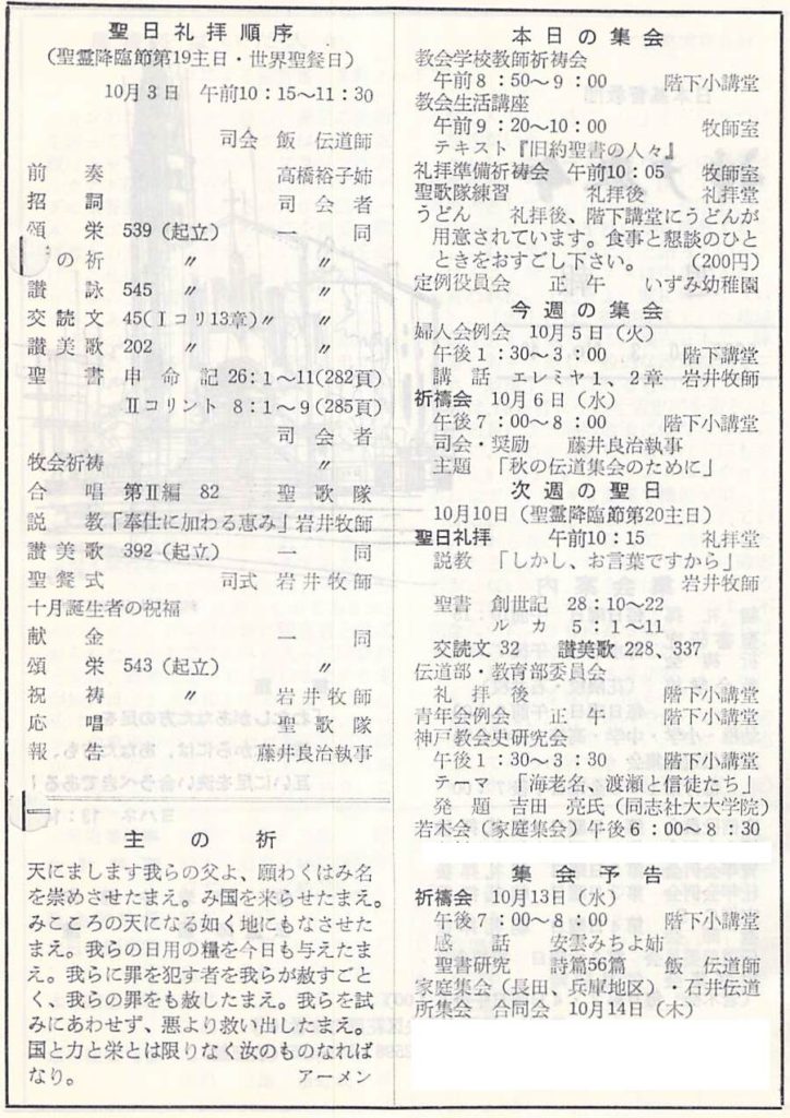(サイト記)この日の週報には、隠退教師を支える運動・百円献金の案内、広島の原爆被爆者老人ホーム清鈴園支援、神戸教会 石井幼稚園園舎建築献金の案内が掲載されている。