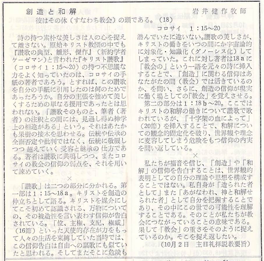 コロサイ人への手紙 1:15-20、説教題「創造と和解」岩井健作