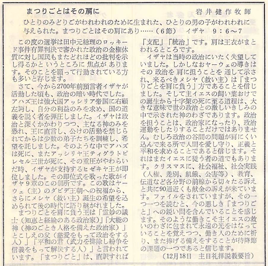 イザヤ 9:6-7、ルカ 1:26-38、説教題「まつりごとはその肩に」岩井健作