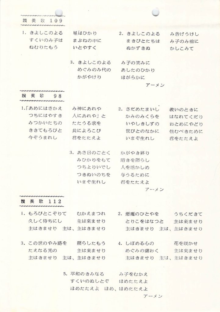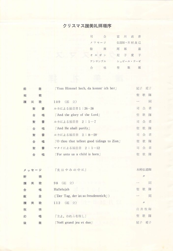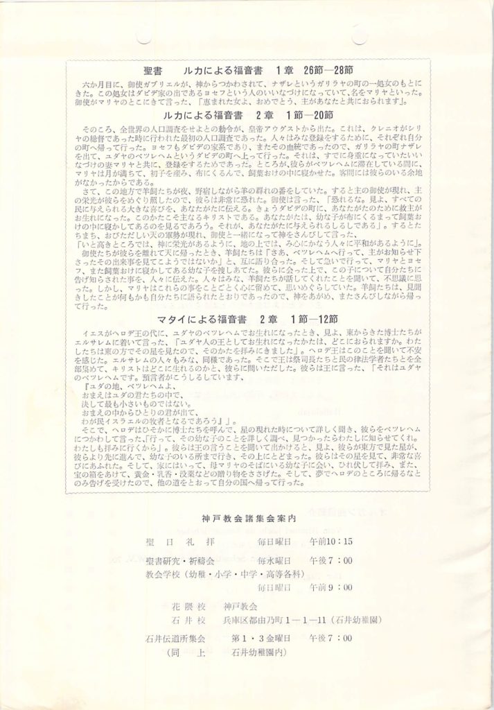 投稿日: 1983-12-242022-10-12 投稿者: 管理者1983年「クリスマス讃美礼拝」当日パンフレット(1983 神戸教会) 1983年12月24日、19:30-20:30、神戸教会(参加374名)健作さん祝祷、説教は木村伝道師(翌日クリスマス礼拝説教「飼葉おけの中に」) 1983年 週報 1983年 説教