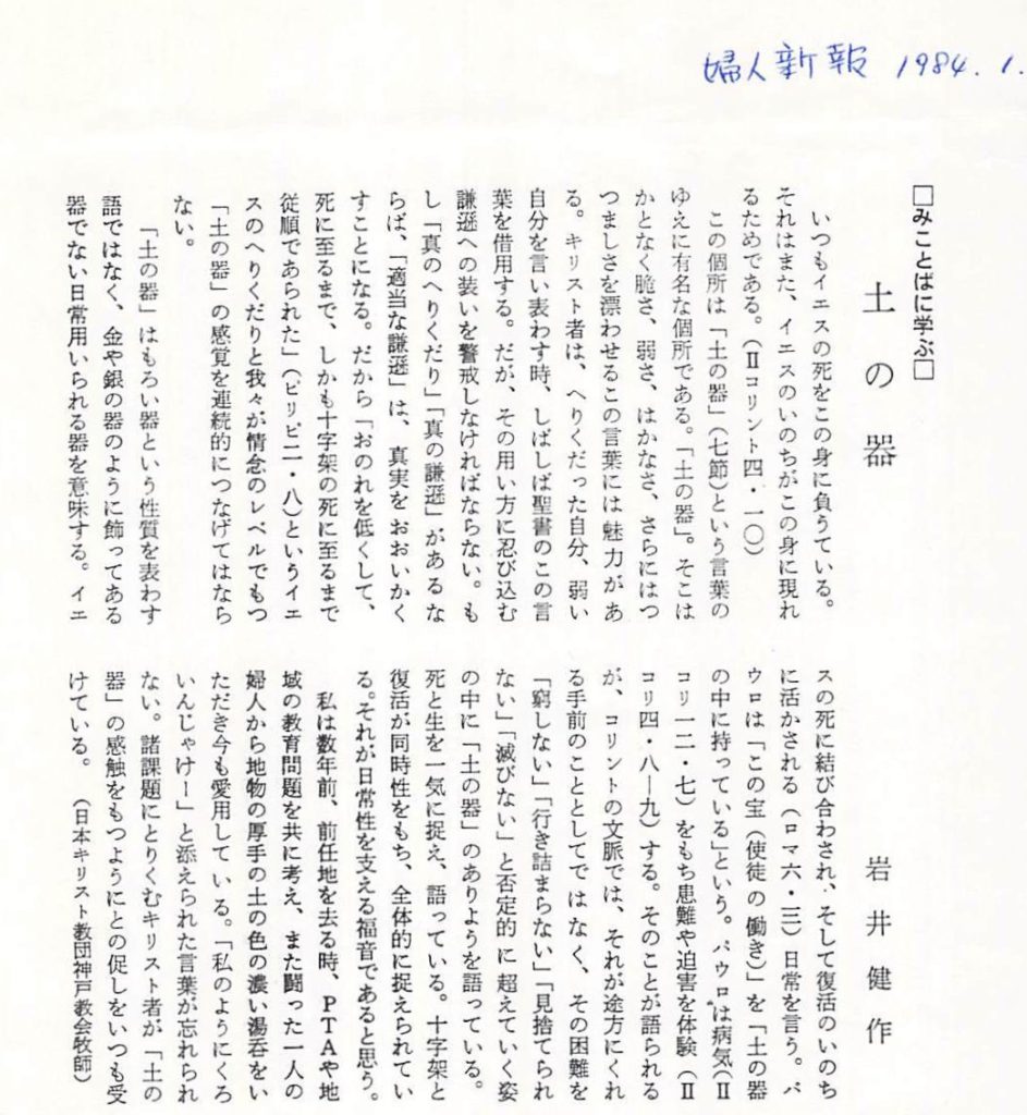 私は数年前、前任地を去る時、PTAや地域の教育問題を共に考え、また闘った一人の婦人から地物の厚手の土の色の濃い湯呑をいただき今も愛用している。「私のようにくろいんじゃけー」と添えられた言葉が忘れられない。諸課題にとりくむキリスト者が「土の器」の感触をもつようにとの促しをいつも受けている。