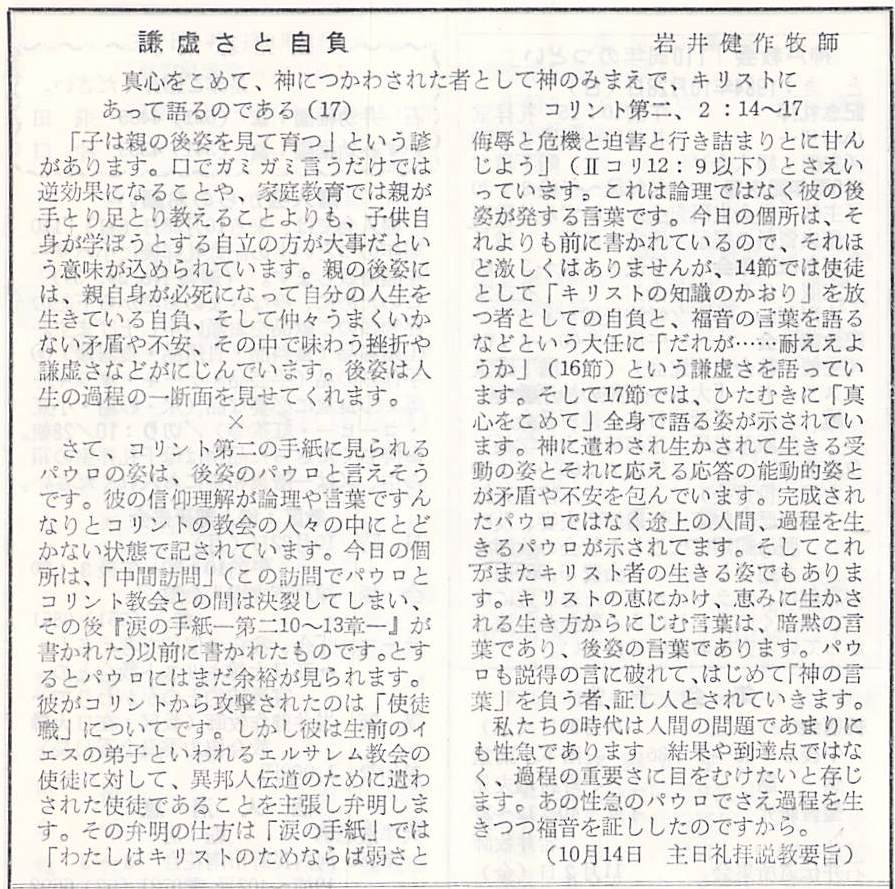 コリント人への第二の手紙 2:14-17、説教題「謙虚さと自負」岩井健作