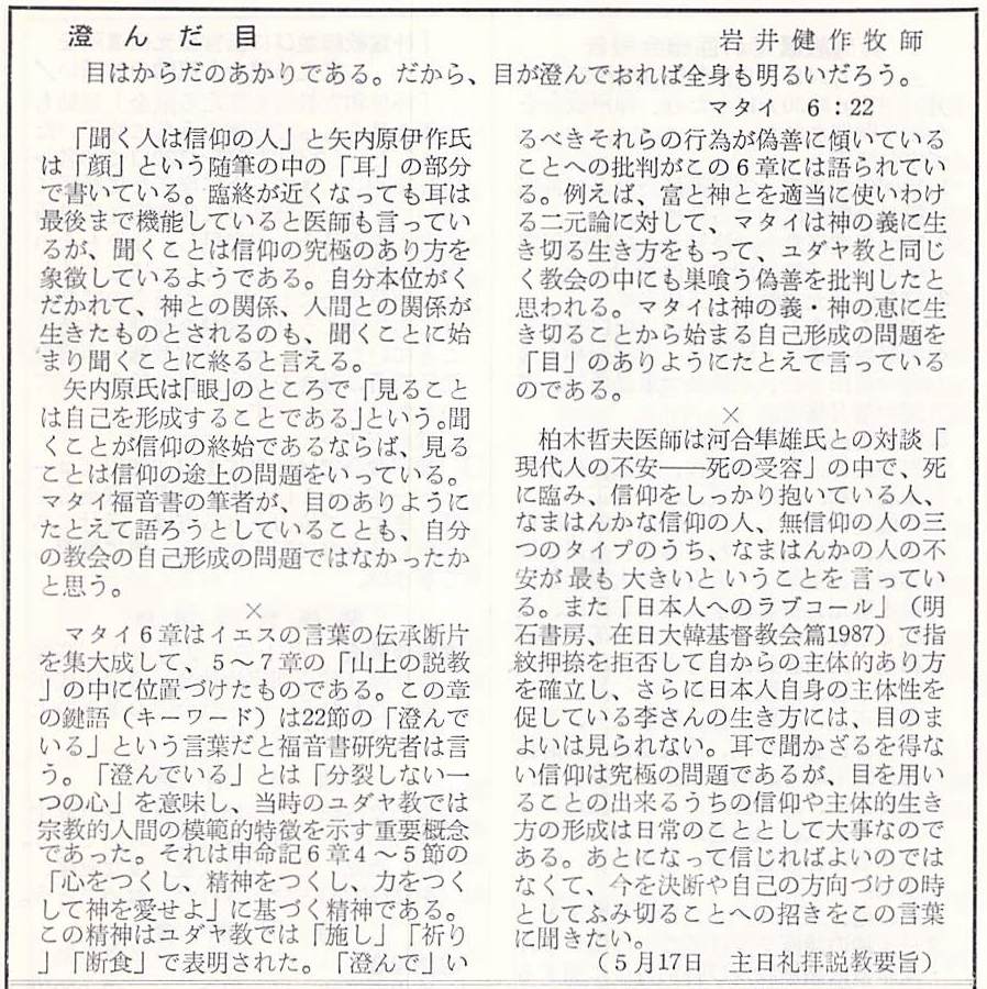 マタイによる福音書 6:19-24、説教題「澄んだ目」岩井健作