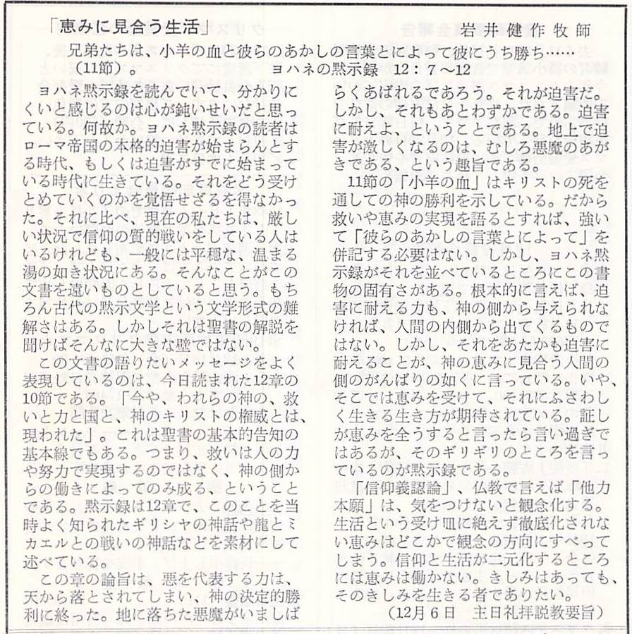 ヨハネの黙示録 12:7-12、説教題「恵みに見合う生活」岩井健作