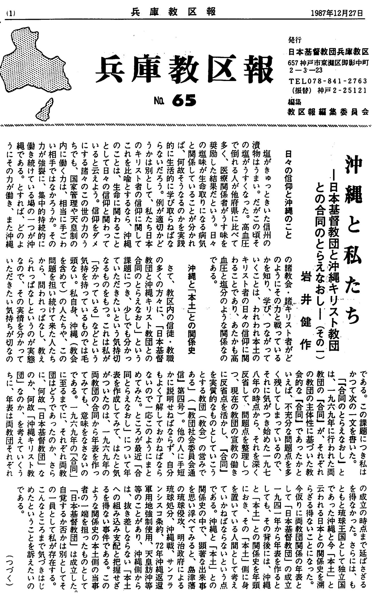 塩がきゅっときいた信州の漬物はうまい。だがこの頃その塩がうすくなった。高血圧で倒れる人が他府県に比べて多く、医療関係者がうす味を奨励した結果だという。日々の塩味が命取りになる病気と関係していることがわかれば、何故そうなるのかを実践的に生活的に学び取らねばならないだろう。例が適切かどうかは別として、私たち日本のキリスト者の信仰に関してこれを比喩とするなら、沖縄のことは、生命に関わることとして日々の信仰と関わっていると云えよう。信仰をダメにする諸々のこの世の力のうちでも、国家管理や天皇制のうちに働く力は、相当に手強い相手ではなかろうか。その力が強烈に、集中的持続的に働き続けている場の一つが沖縄である。とすれば、どのようにその力が働き、また沖縄の諸教会・諸キリスト者がどのようにその力と戦っているかを知り、学び、繋がっていくことは、われわれ本土のキリスト者の日々の信仰に関わることであり、あたかも高血圧と塩分のような関係なのである。