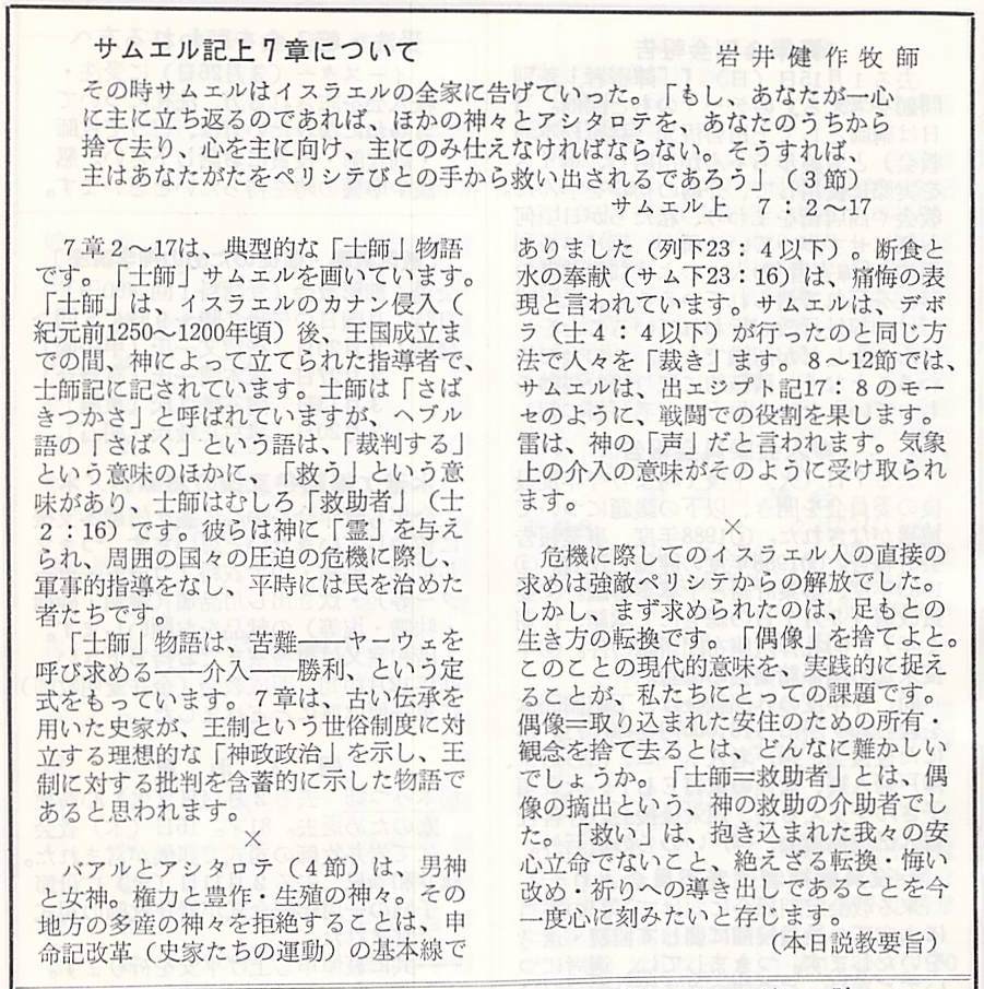 サムエル記上 7:2-17、説教題「悔い改めと祈りの日」岩井健作