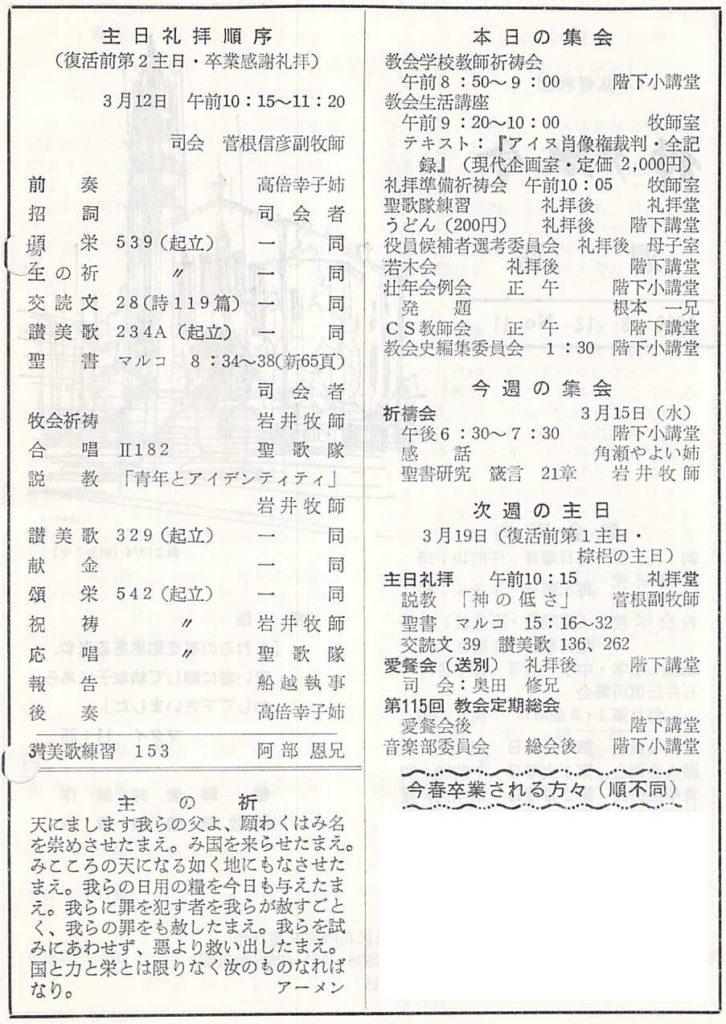 1989年3月12日、復活前第2主日、卒業感謝礼拝