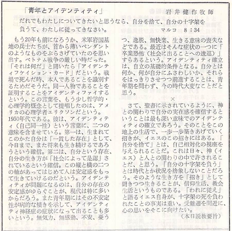 マルコによる福音書 8:34-38、説教題「青年とアイデンティティー」岩井健作