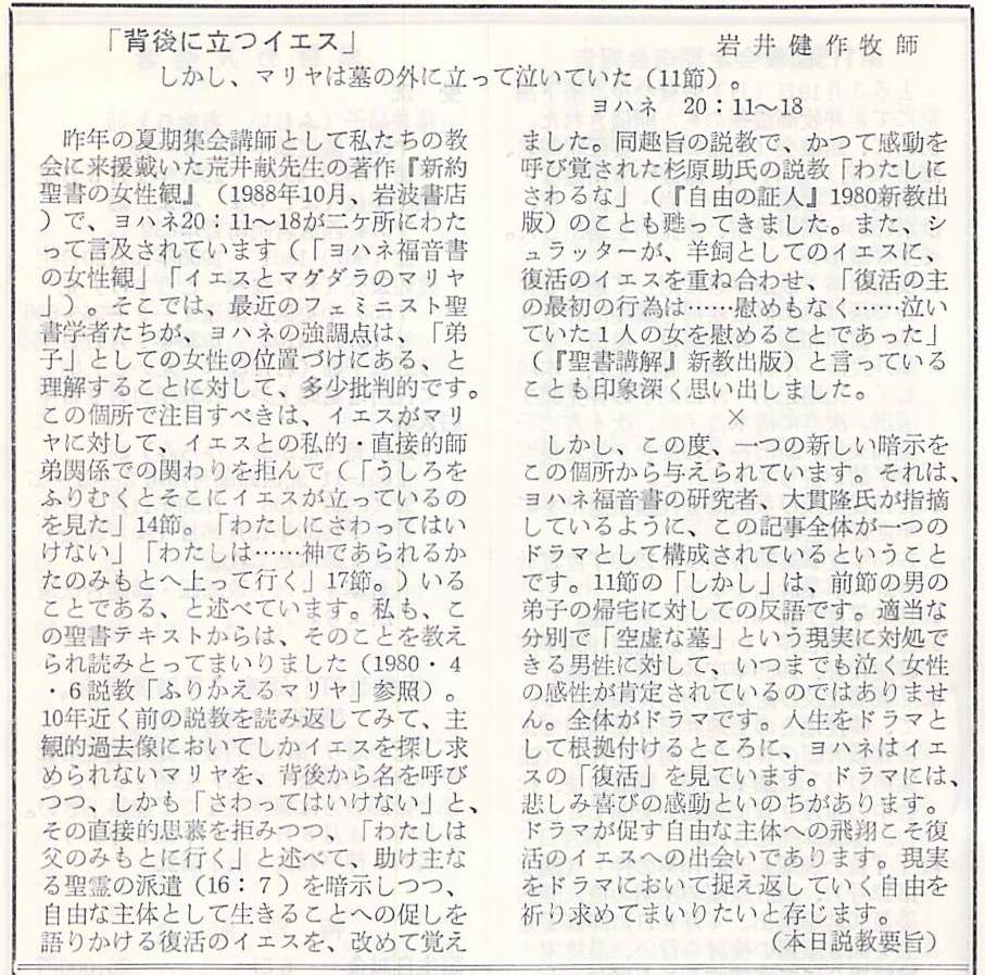 昨年(1988年)の夏期集会講師として、私たちの教会に来援いただいた荒井献先生の著作『新約聖書の女性観』(荒井献、岩波書店 1988年10月)の中で、今日の箇所であるヨハネ福音書20章11節〜18節が、2箇所(ヨハネ福音書の女性観、イエスとマグダラのマリヤ)にわたって言及されています。