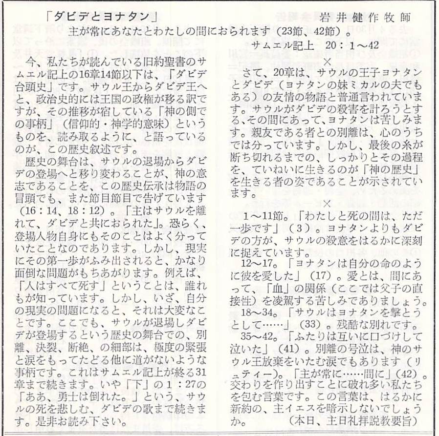 サムエル記上 20:1-42、説教題「ダビデとヨナタン」岩井健作