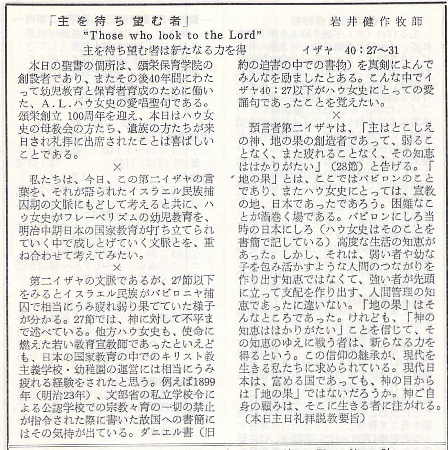 本日の聖書の箇所は、頌栄保育学院の創設者であり、またその後40年間にわたって幼児教育と保育者育成のために働いた、A.L.ハウ女史(Annie Lyon Howe、1852-1943)の愛誦(しょう)聖句である。