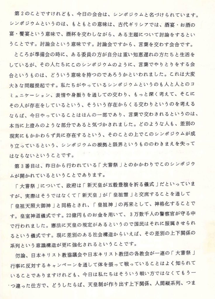 第3番目は、昨日から行われている「大嘗祭」とのかかわりでこのシンポジウムが開かれているということであります。「大嘗祭」については、政府は「新天皇が五穀豊穣を祈る儀式」だと言っていますが、実際はそうではなく「新天皇」が「皇祖霊」と交流することを通して「皇祖天照大御神」と同格とされ「皇祖神」の再来として神格化されることです。皇室神道儀式です。22億円のお金を用いて3万数千人の警察官が守る中で行われました。憲法に天皇の規定があるというので国民はそれに服属させられるという儀式です。現に差別のある社会構造から言えば、その差別の上下関係の系列という意識構造がさらに強化されるということです。もちろん日本キリスト教協議会や日本基督教団の各教会が一連の「大嘗祭」行事に反対するキャンペーンを通して体を張って戦っていることはよく知られていることでありますけれども、今日は私たちはそういう戦い方ではなくてもう一つ違った仕方で、どうしたら天皇制が作り出す上下関係、人間縦系列、つまり弱者を差別する体質を他人事ではなくて自分の内側をも含めて克服し戦っていけるかということを、共に考えようとする会合なのだという点です。