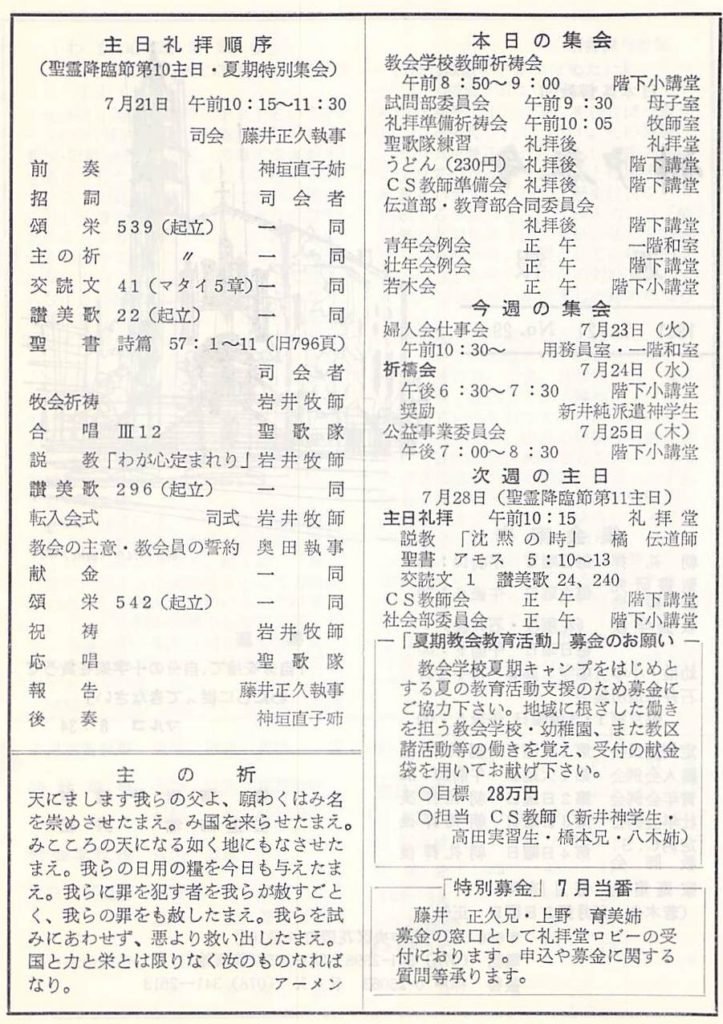 1991年7月21日、神戸教会週報、聖霊降臨節第10主日礼拝