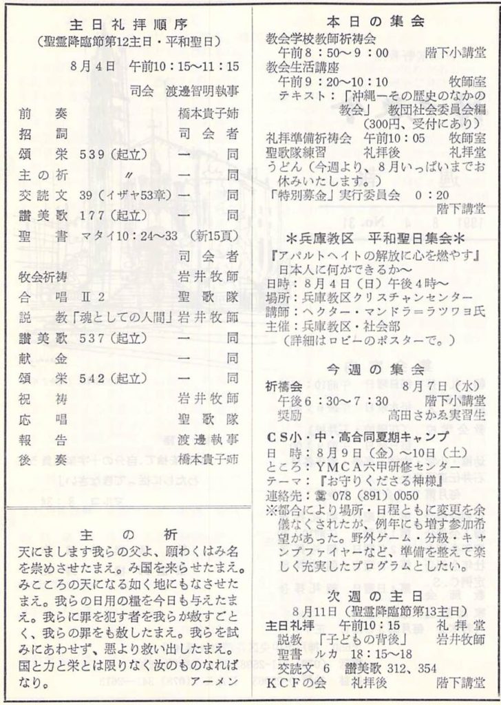 1991年8月4日、神戸教会週報、聖霊降臨節第12主日礼拝、平和聖日