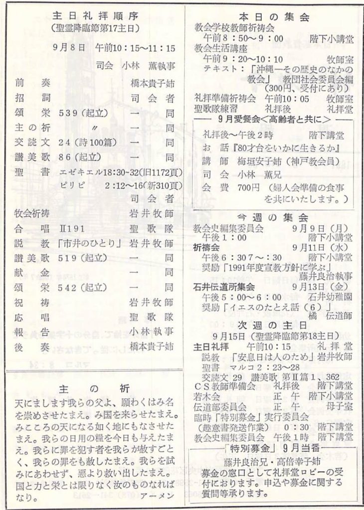 1991年9月8日、神戸教会週報、聖霊降臨節第17主日礼拝