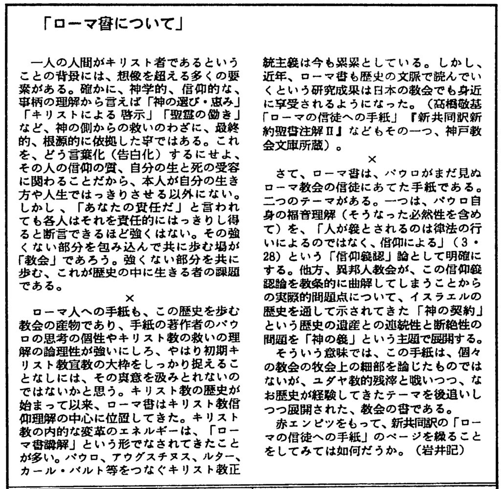 高橋敬基「ローマの信徒への手紙」(『新共同訳聖書注解Ⅱ』日本基督教団出版局 1991.1)などもその一つ、これは神戸教会文庫で所蔵している。
