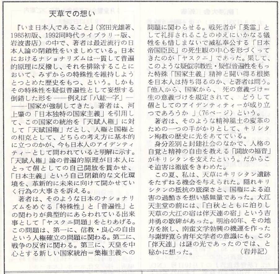 『いま日本人であること』(宮田光雄著、岩波書店 1985年初版、1992年同時代ライブラリー版)の中で、著者・宮田光雄氏は最近流行の日本人論の閉鎖性を戒めている。