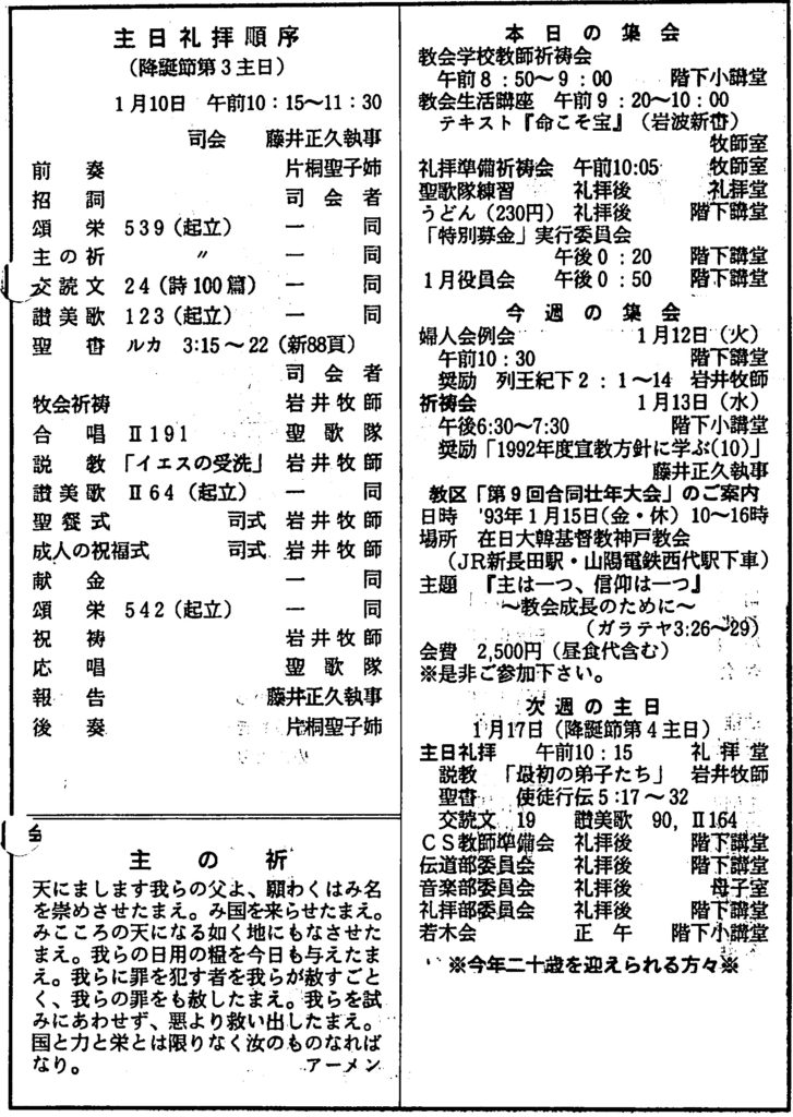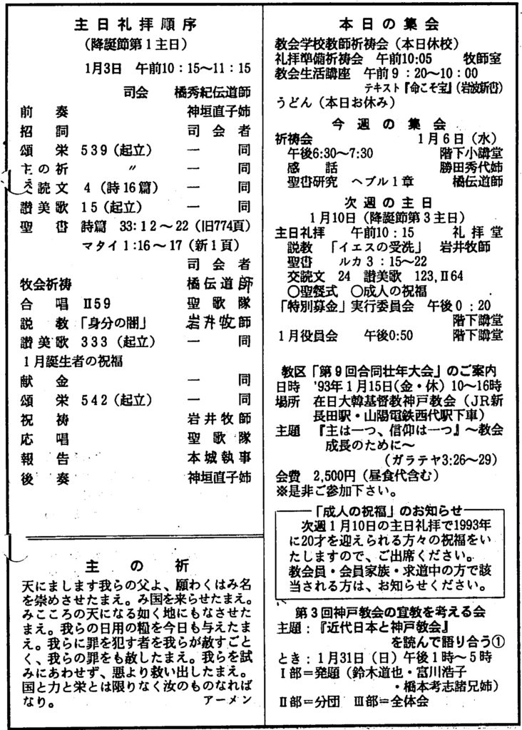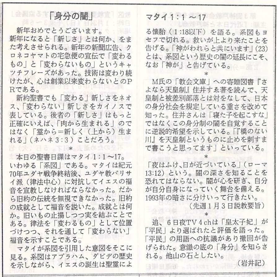 1993年1月10日、神戸教会週報所収