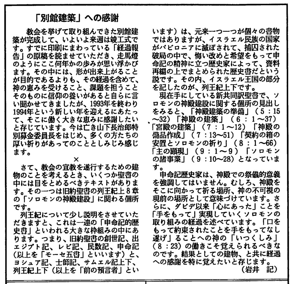 その中には、形が出来上がることが目的であるよりも、その経過を含めて、神の恵みを受けること、課題を担うこと、そのものに信仰の養いがある、と自らに言い聞かせてきましたが、1993年を終わり、1994年という新しい年を迎えるにあたって、そこに働く大きな恵みに感謝したいと存じています。
