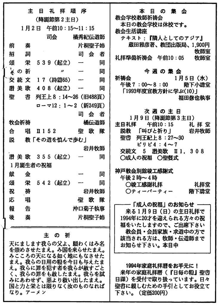 1994年1月2日、神戸教会週報