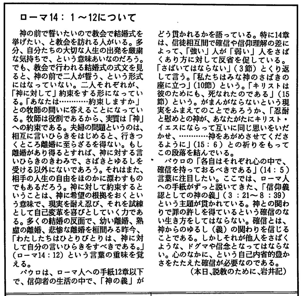 この日の説教、ローマ 14:1-12「心の中で確信を」岩井健作