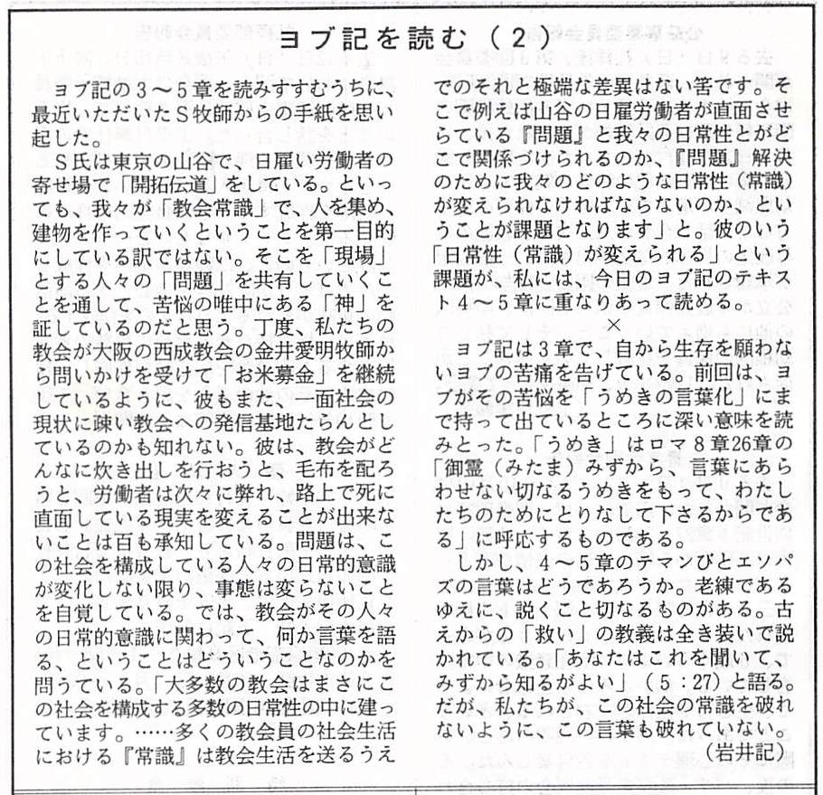 ”大多数の教会はまさにこの社会を構成する多数の日常性の中に建っています。……多くの教会員の社会生活における「常識」は教会生活を送る上でのそれと極端な差異はないはずです。そこで例えば山谷の日雇い労働者が直面させられている「問題」と我々の日常性とがどこで関係づけられるのか、問題解決のために我々のどのような日常性(常識)が変えられなければならないのか、ということが課題となります。”(S牧師からの手紙)