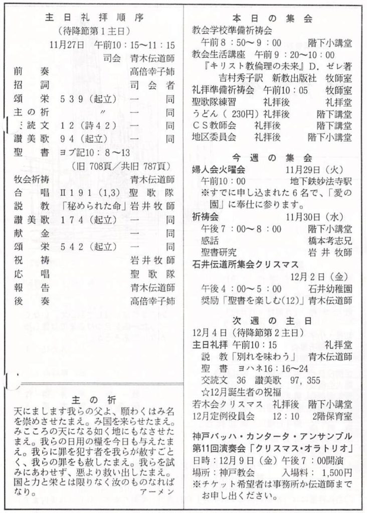 1994.11.27、神戸教会週報、待降節第1主日・震災の50日前