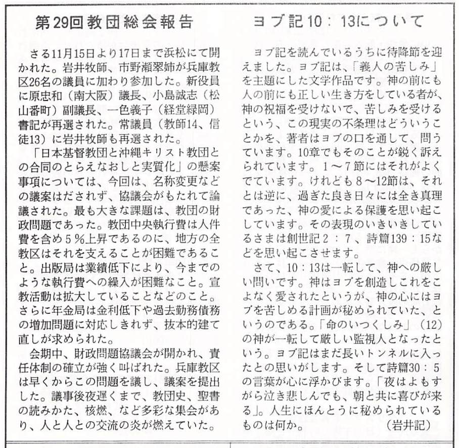 新役員に原忠和議長(南大阪)、小島誠志副議長(松山番町)、一色義子書記(経堂緑岡)が再選された。常議員(教師14、信徒13)に岩井牧師も再選された。