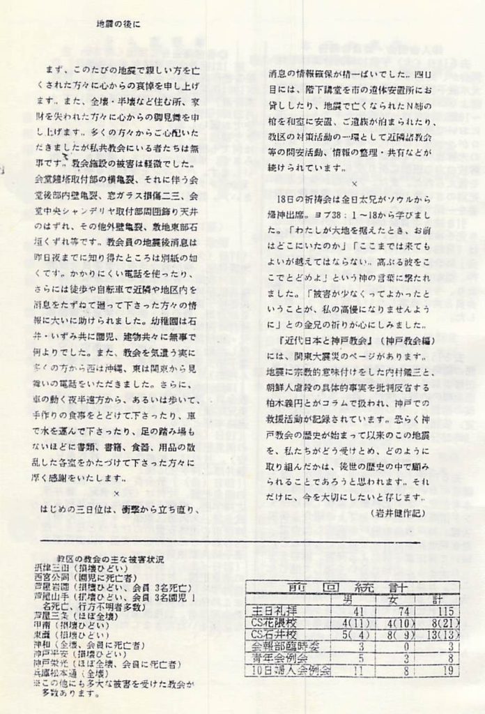 おそらく神戸教会の歴史が始まって以来のこの地震を、私たちがどう受けとめ、どのように取り組んだかは、後世の歴史の中で顧みられることであろうと思います。