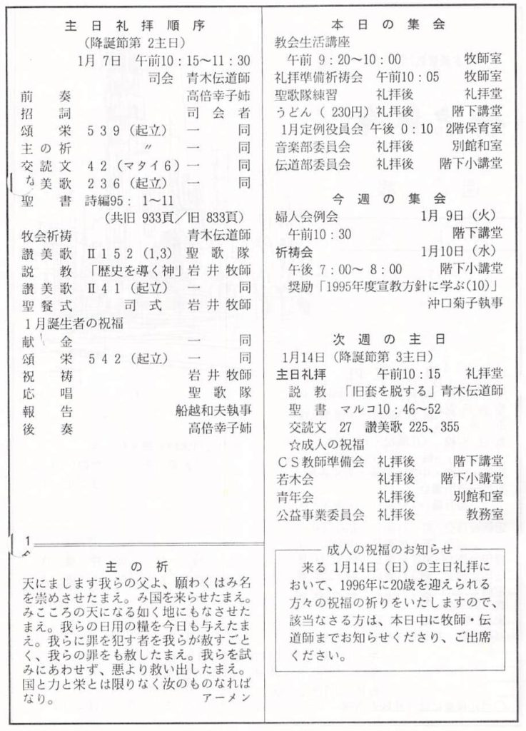 1996.1.7、神戸教会週報、降誕節第2主日