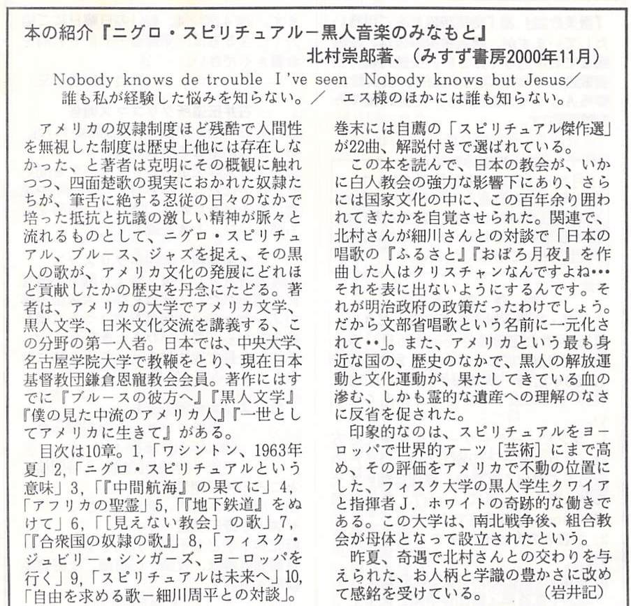 また、アメリカという最も身近な国の、歴史の中で、黒人の解放運動と文化運動が果たしてきている血の滲むような、しかも霊的な遺産への理解のなさに反省を促された。