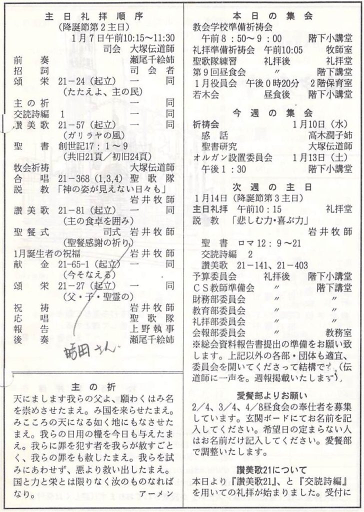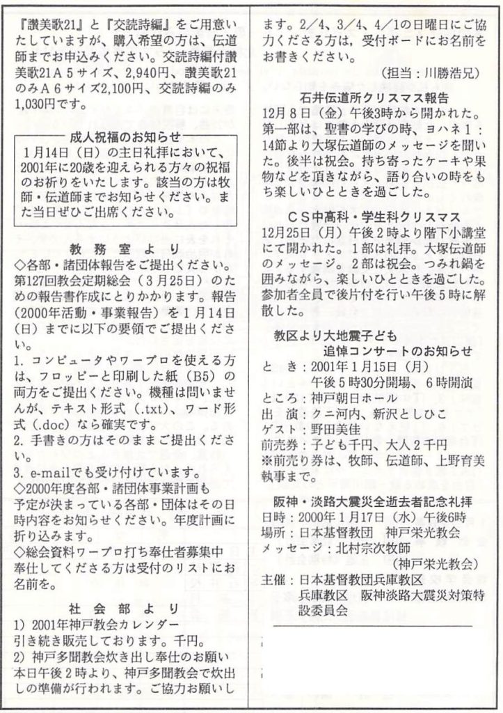 2001.1.7、 神戸教会週報、降誕節第2主日、震災から6年