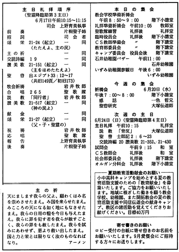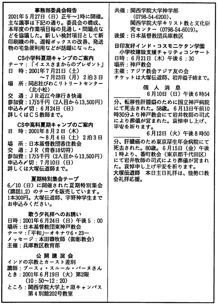 2001.6.17、 神戸教会週報、聖霊降臨節第3主日