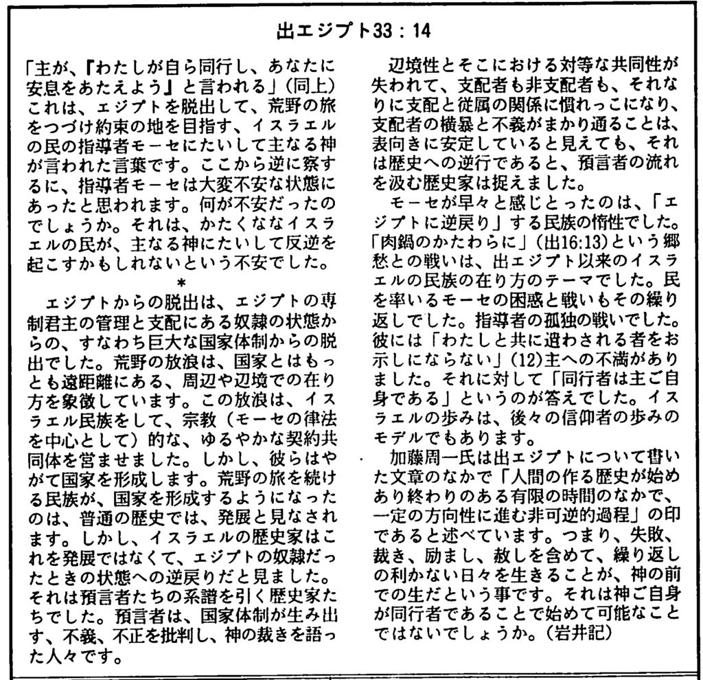 加藤周一氏は出エジプトについて書いた文章の中で「人間の作る歴史が始めあり終わりのある有限の時間の中で、一定の方向性に進む非可逆的過程」の徴であると述べています。