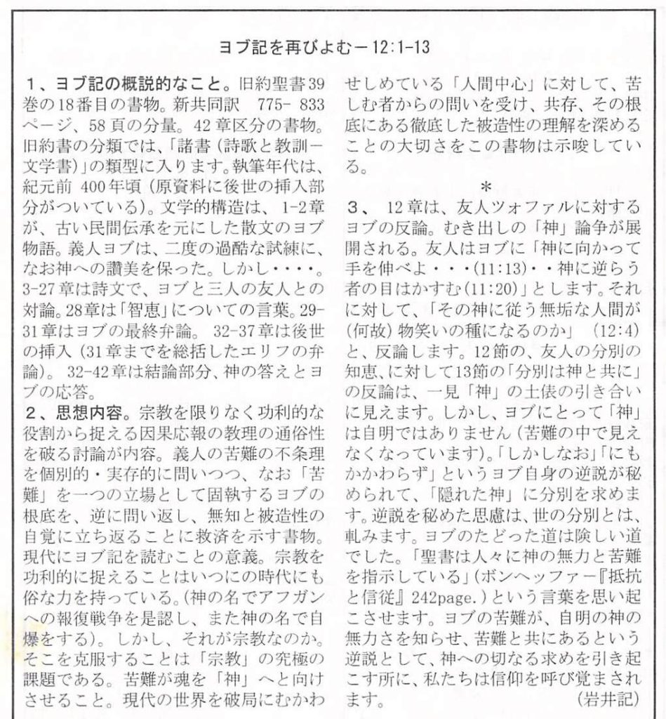 ヨブ記 12:1-13、説教題「分別が世界を救うのか」